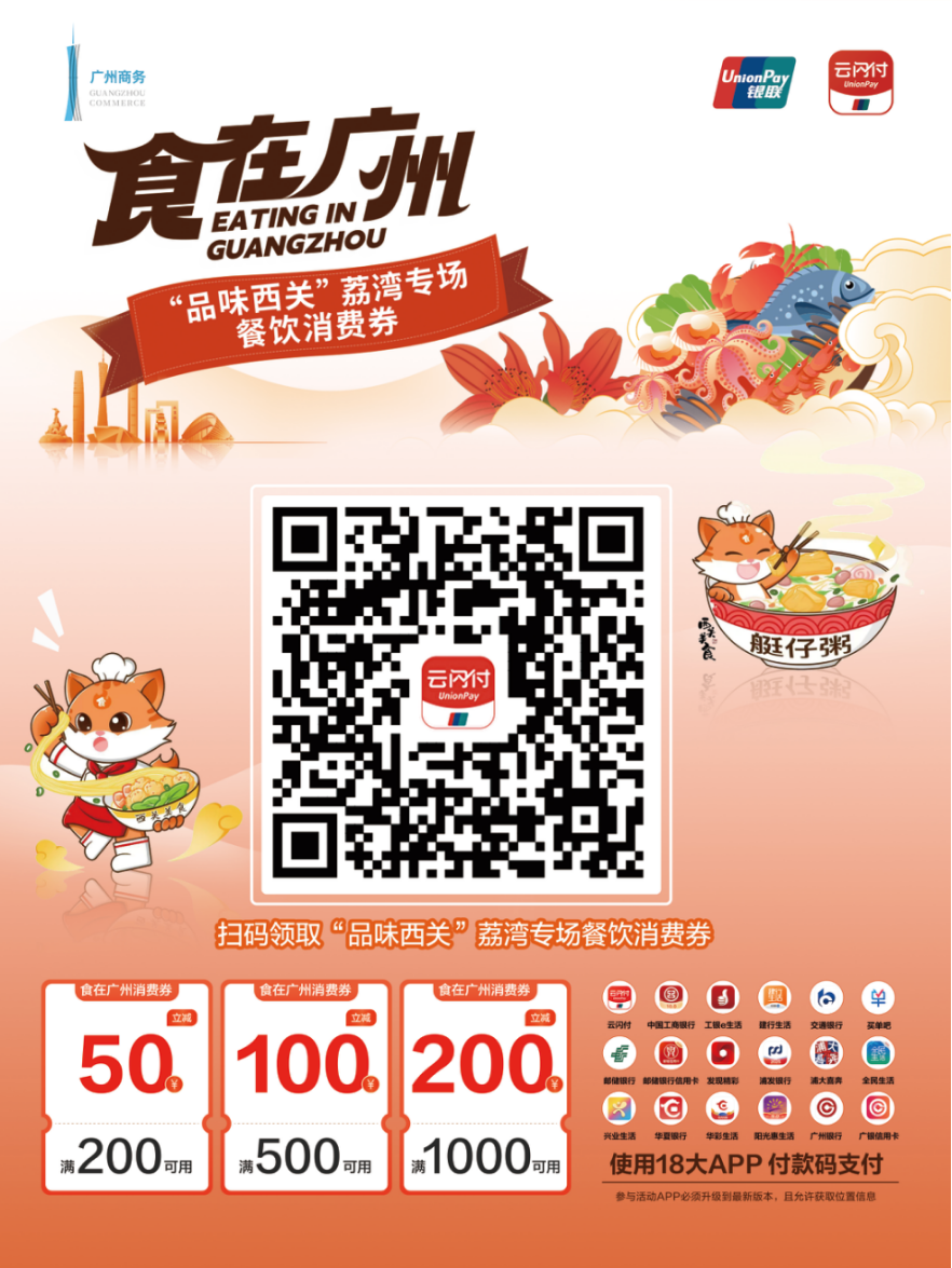 1.活动期间,用户定位在“粤味葡韵·舌尖绽放”活动现场(需打开定位并在活动地点上下九商业步行街1km范围内),通过云闪付APP或者指定银行APP扫码领取“品味西关”专项餐饮消费券(不支持通过远程方式扫码领券)。
